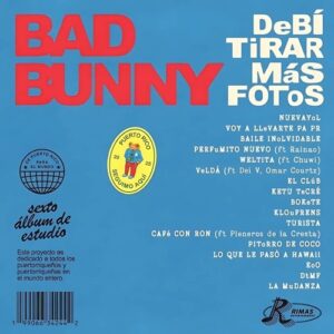 El álbum que abarcó este exitoso proyecto es “DeBÍ TiRAR MáS FOToS”, que es sin duda alguna el disco de estudio más representativo de Bad Bunny. Muestra su evolución como persona y artista, con la utilización de los sonidos autóctonos, géneros musicales como la plena, salsa y reggaetón que representan al país, y con las colaboraciones de artistas locales: Chuwi (banda local que tomó gran repercusión con el tema “WELTiTA”), Rainao en “PERFuMiTO NUEVO”, Los Pleneros de la Cresta «CAFé CON RON” y Dei V y Omar Courtz en “VeLDÁ”. La portada representa al pueblo, con las sillas de plástico que vemos en casas, patios, fiestas y la vegetación del país, Y en Tik Tok, Instagram, con las letras se han formado tendencias de hacer videos con fotos de familiares que quizás ya no estén en este mundo pero siempre en nuestra mente y corazones, representando la unión, la esperanza y el querer a nuestra familia.