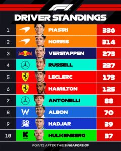 No todo fueron discusiones para los de McLaren, ya que con el podio obtenido por Norris y el cuarto lugar de Piastri la escudería se quedó por segundo año consecutivo con el campeonato de constructores, a falta de 6 carreras para el final. Con un dominio absoluto, suma 650 puntos en los 18 Grandes Premios disputados, con una distancia de 325 puntos sobre su escolta, Mercedes (325 pts.).