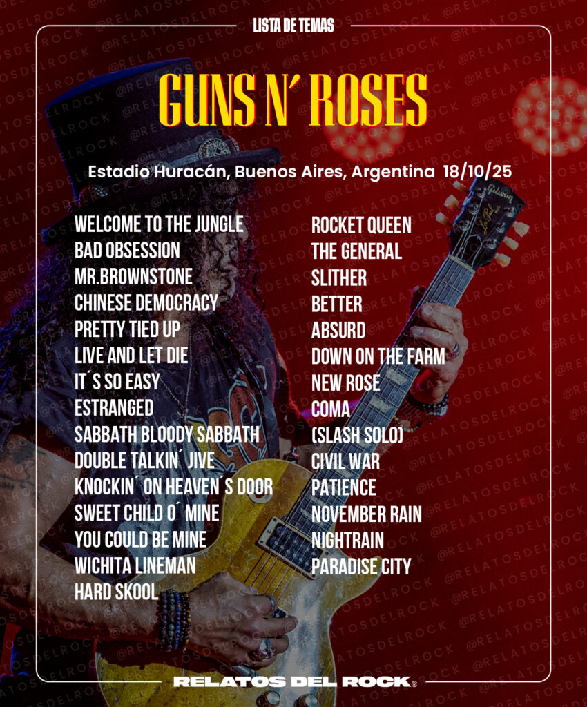 Y la canción que cerró la noche en Huracán, fue Paradise City. Argentina vivió otra noche más para la historia del rock, una noche que pasó por todas las sensaciones, la desazón en Axl Rose, la felicidad por escuchar a su banda favorita y la emotividad que transmiten las canciones, la nostalgia, el volver a encontrarse con una banda que quizás cuando eran chicos escuchaban, allá por los 90, y escucharlos en 2025 más vigentes que nunca, y, justamente, Paradise City coronó en dos noches épicas que quedarán para la eternidad.